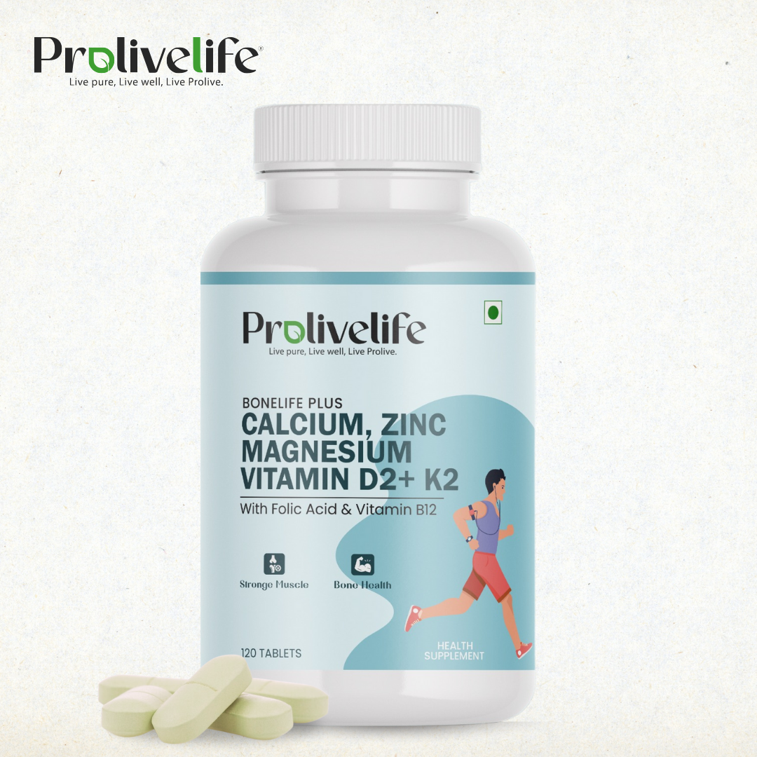ProLiveLife BoneLife Plus is a comprehensive health supplement designed to support strong bones, healthy muscles, and overall well-being. Enriched with a powerful blend of Calcium, Zinc, Magnesium, Vitamin D2, Vitamin K2 (MK-7), Folic Acid, and Vitamin B12, this formulation helps strengthen your skeletal system, boost muscle function, and enhance energy levels. Ideal for individuals of all ages, this supplement provides essential nutrients to maintain an active and balanced lifestyle.
